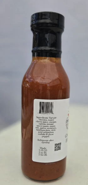 Ingredients: Fresh Colorado Cherries, cherry juice, water, smoked carrots, granulated onions, tomato paste, sugar, vinegar, Worcestershire Sauce(Gluten FREE Lee and Perrins), molasses, salt and smoked Ghost pepper.