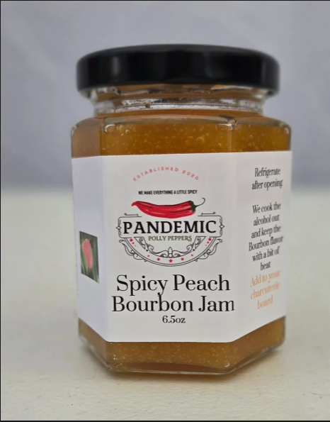 Spicy Peach Bourbon Jam made sweet with a little heat from the beloved Ghorpion pepper which is a cross between a Ghost and a Scorpion pepper. Complex fruity/berry flavor.