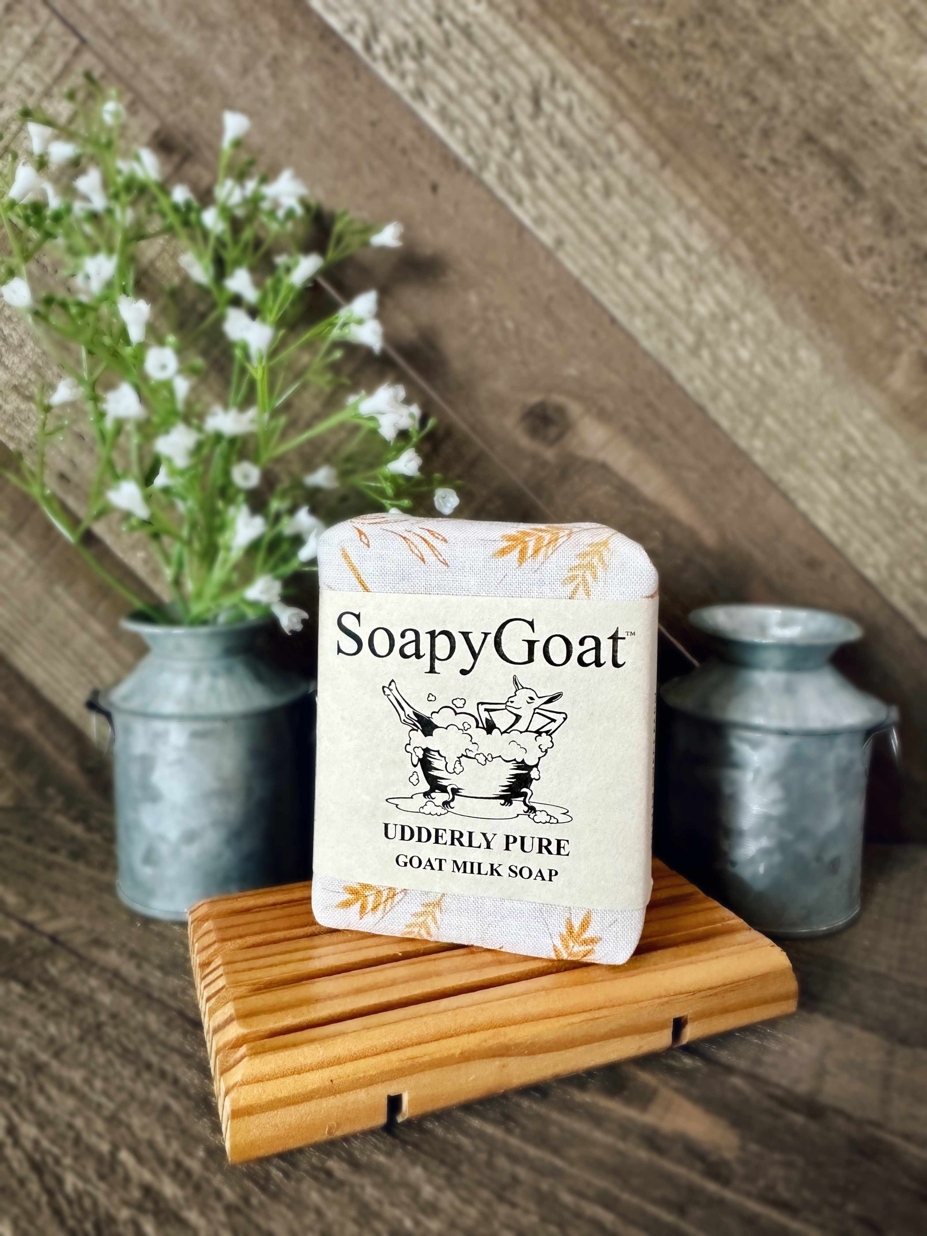 4oz bar of creamy suds contains saponified oils of coconut oil, palm oil and rice bran oil, canola oil, creamy goat milk and fragrance oil and or essential oil. Wrapped in cotton fabric. Fabric my vary with availability.