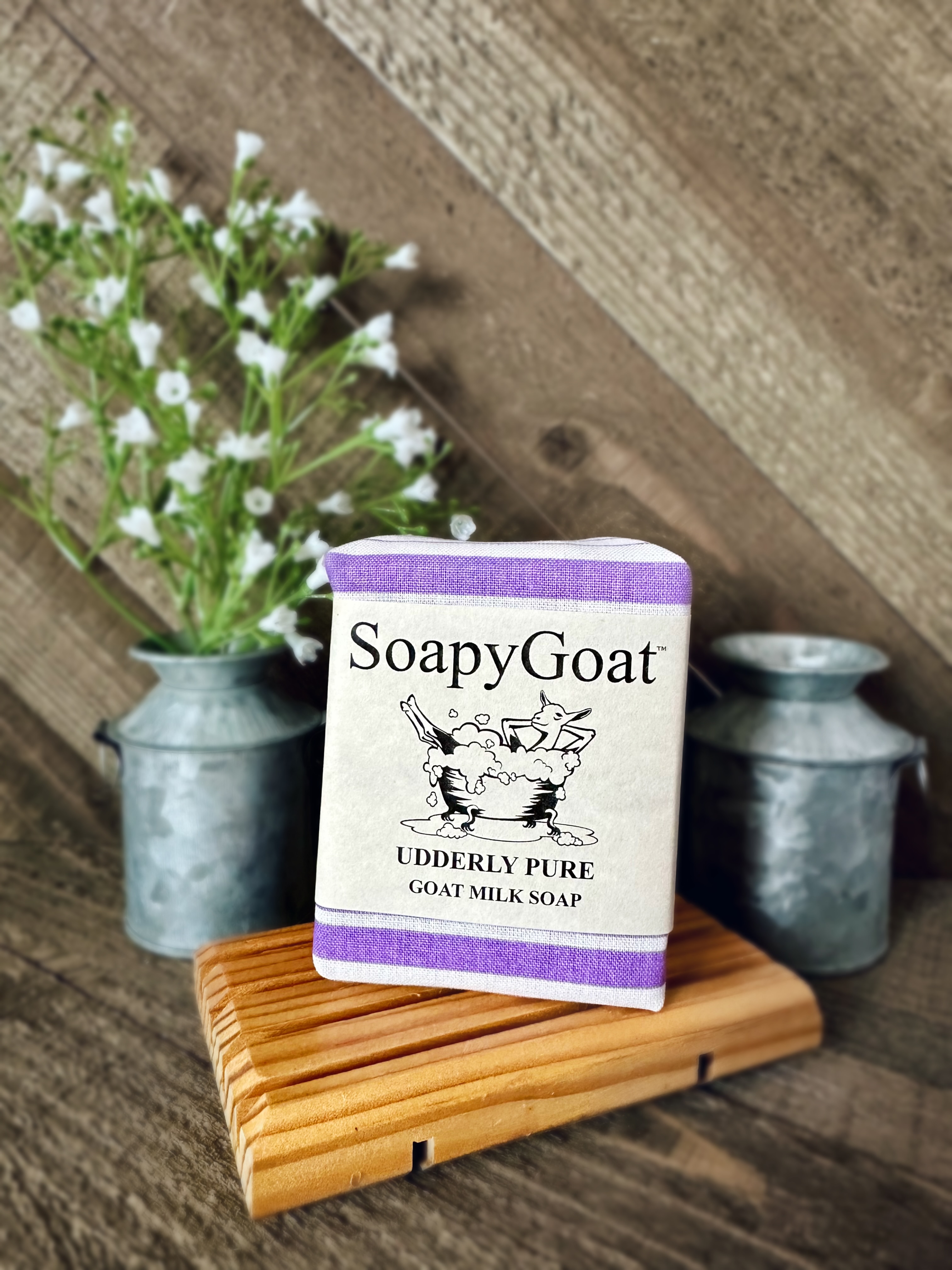 4oz bar of “creamy suds” contains saponified oils of palm, coconut, rice bran and canola. Creamy goats milk and fragrance and or essential oil. All wrapped in cotton fabric. Fabric may vary with availability.
