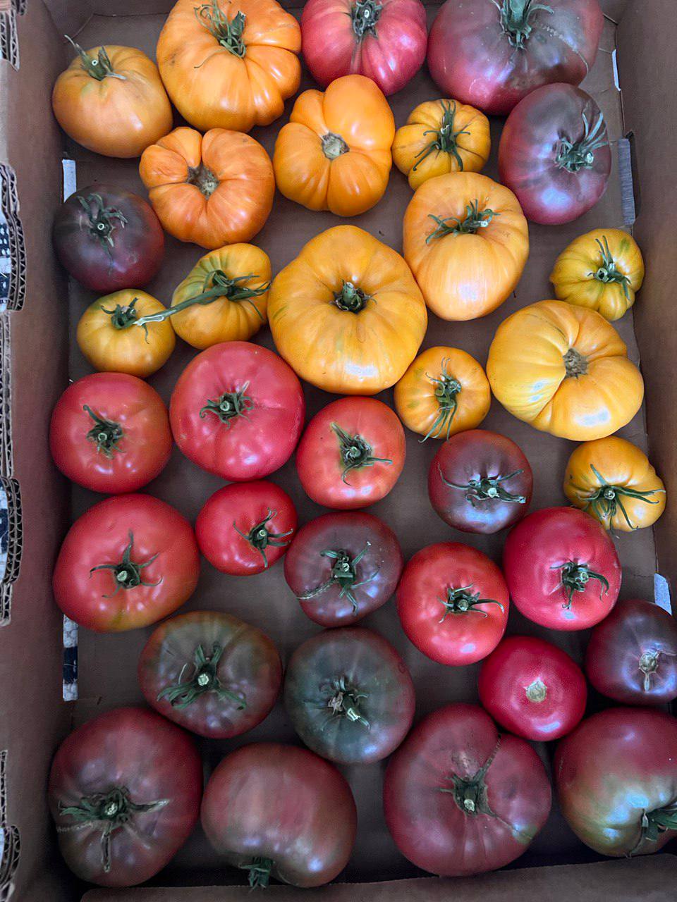 15# flats of mixed heirloom tomatoes. Field grown. All organic.