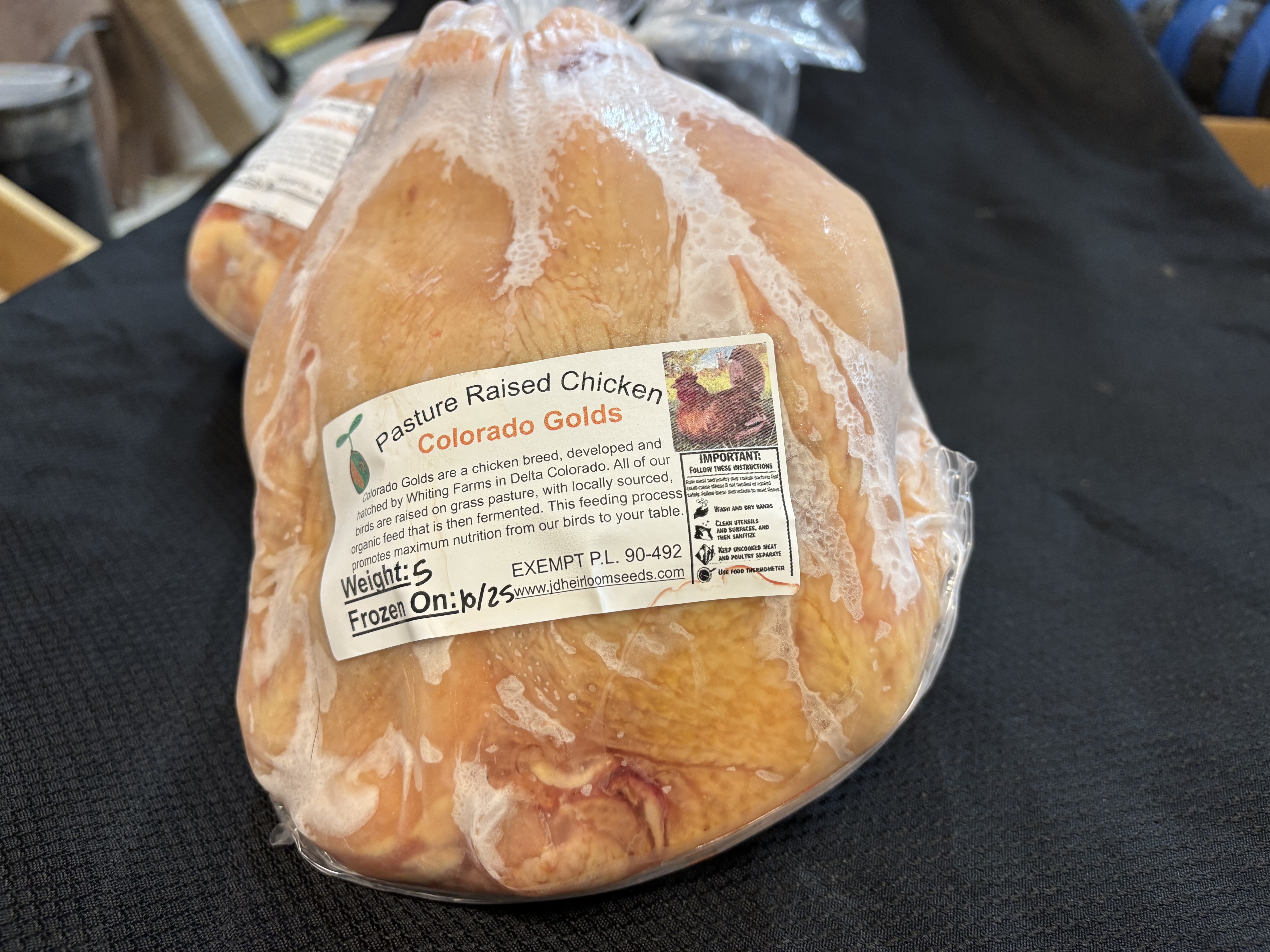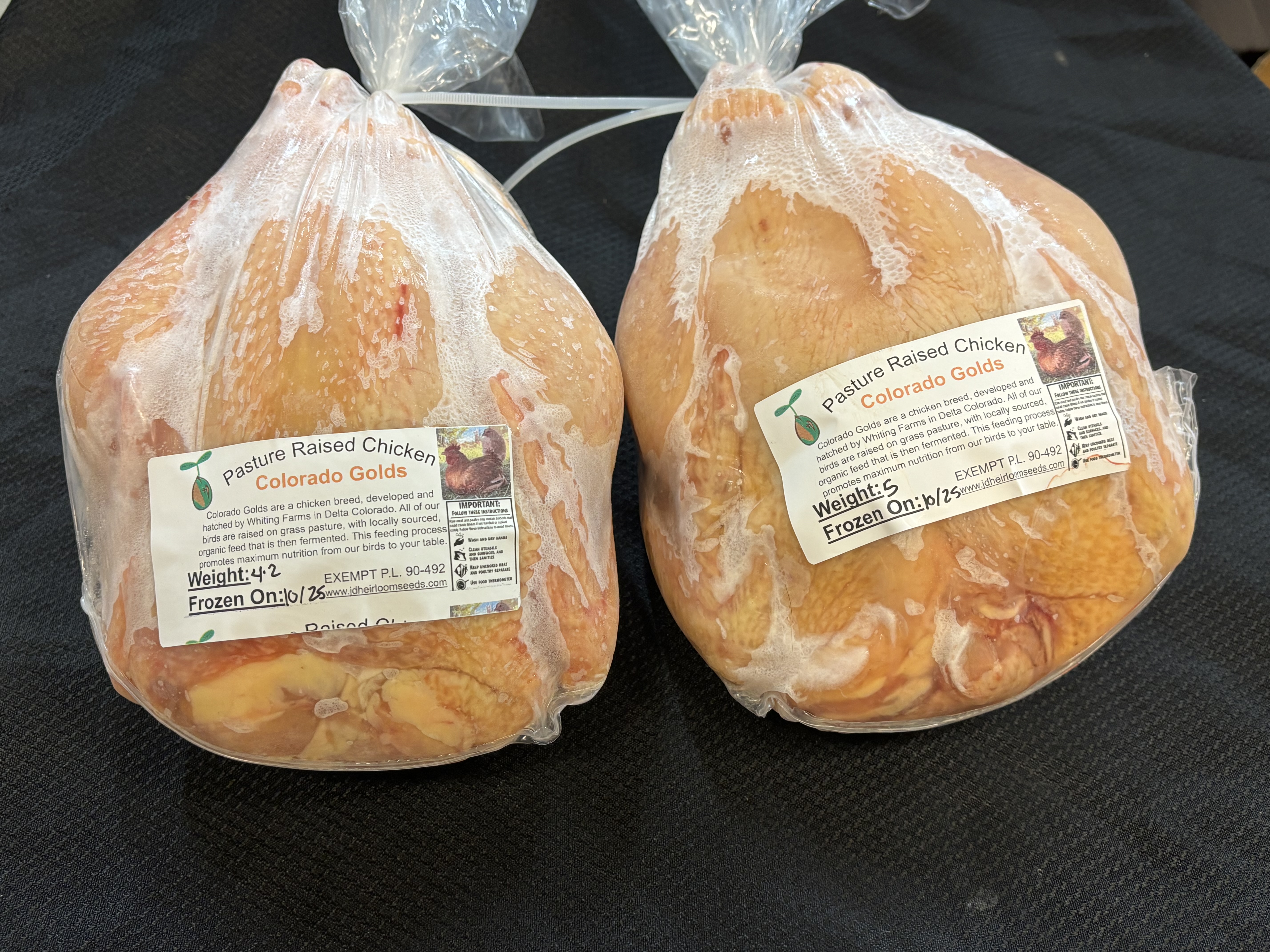 Colorado Gold Meat Birds, raised on grass pastures with locally sourced, fermented and organic feed. Due to our sustainable feeding practices, this chicken meat has a naturally rich flavor and healthy fat content.